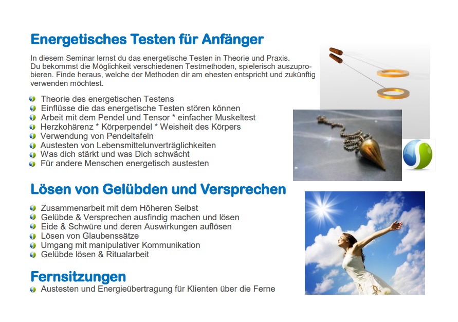 In diesem Workshop lernst du das energetische Testen in Theorie und Praxis. Du bekommst die Möglichkeit verschiedenen Testmethoden, spielerisch auszuprobieren.